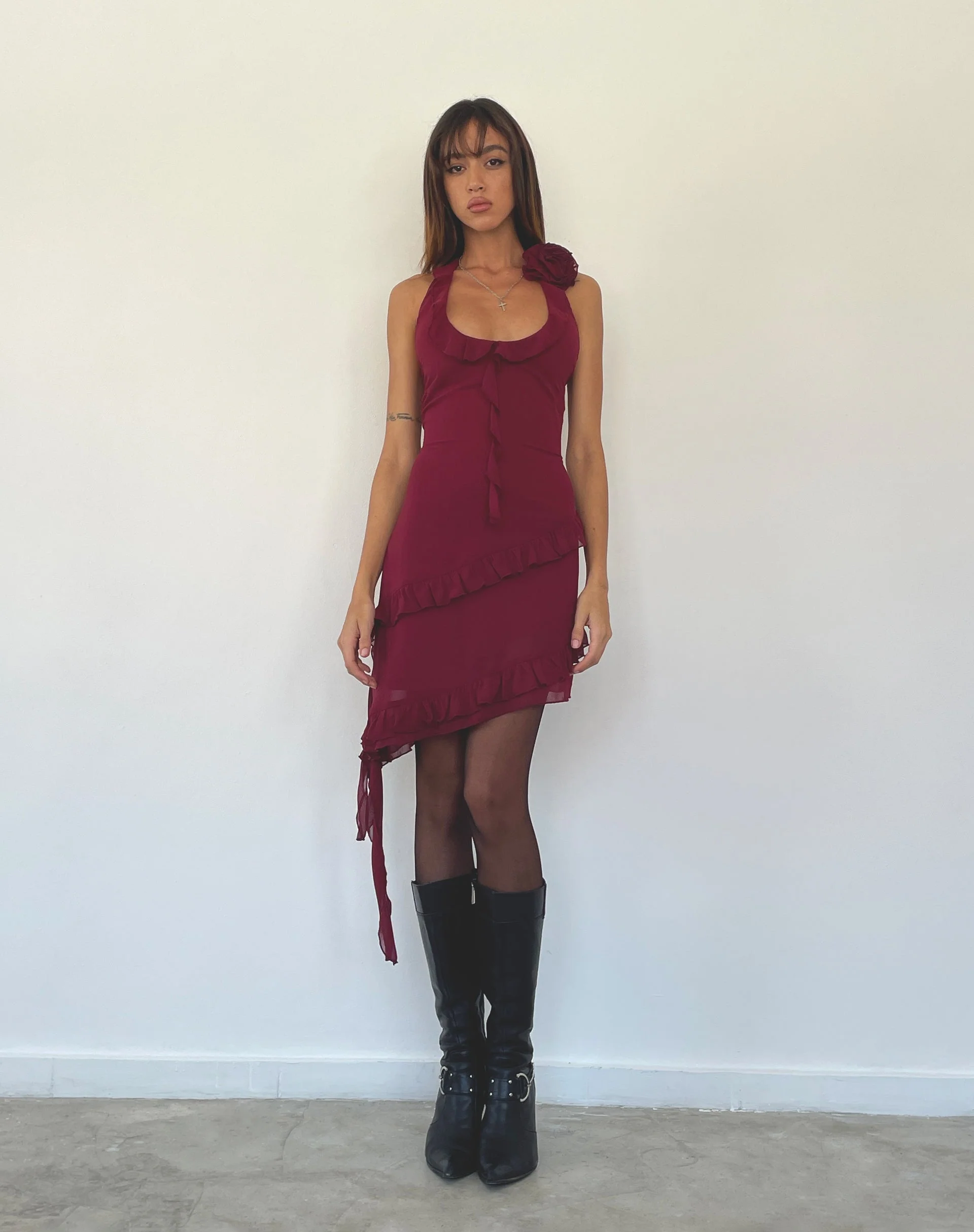 Margaret Ruffle Mini Dress in Plum Chiffon with Rosette