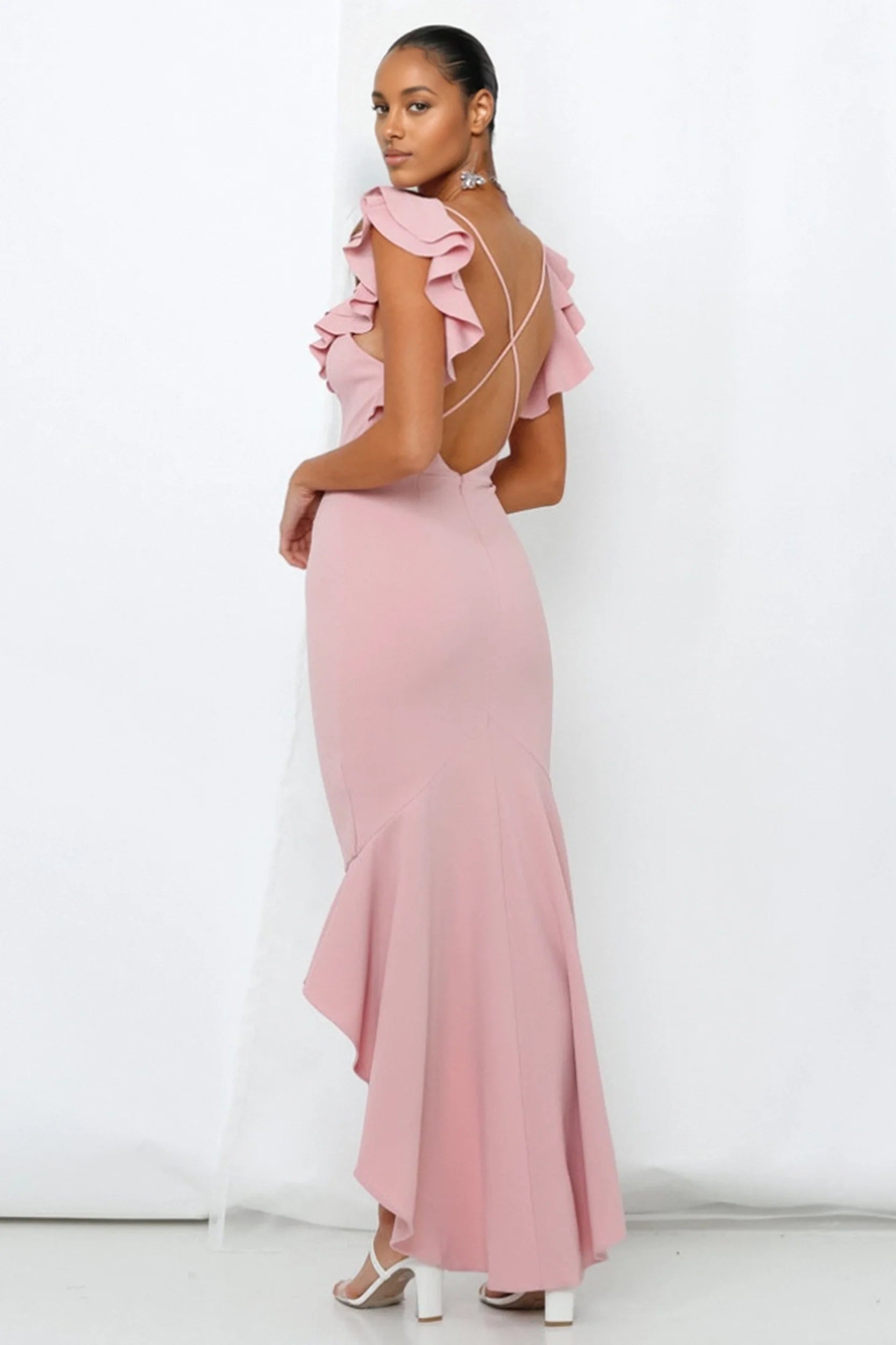 Gurrrl make some drama in this show stopping number! The Hills Maxi Dress features a hi-low ruffle hem, invisible back zipper, tubular crossover detailing on the back and a feminine v-neckline. We love wearing ours with a smokey eye, bold clutch and sleek high pony!