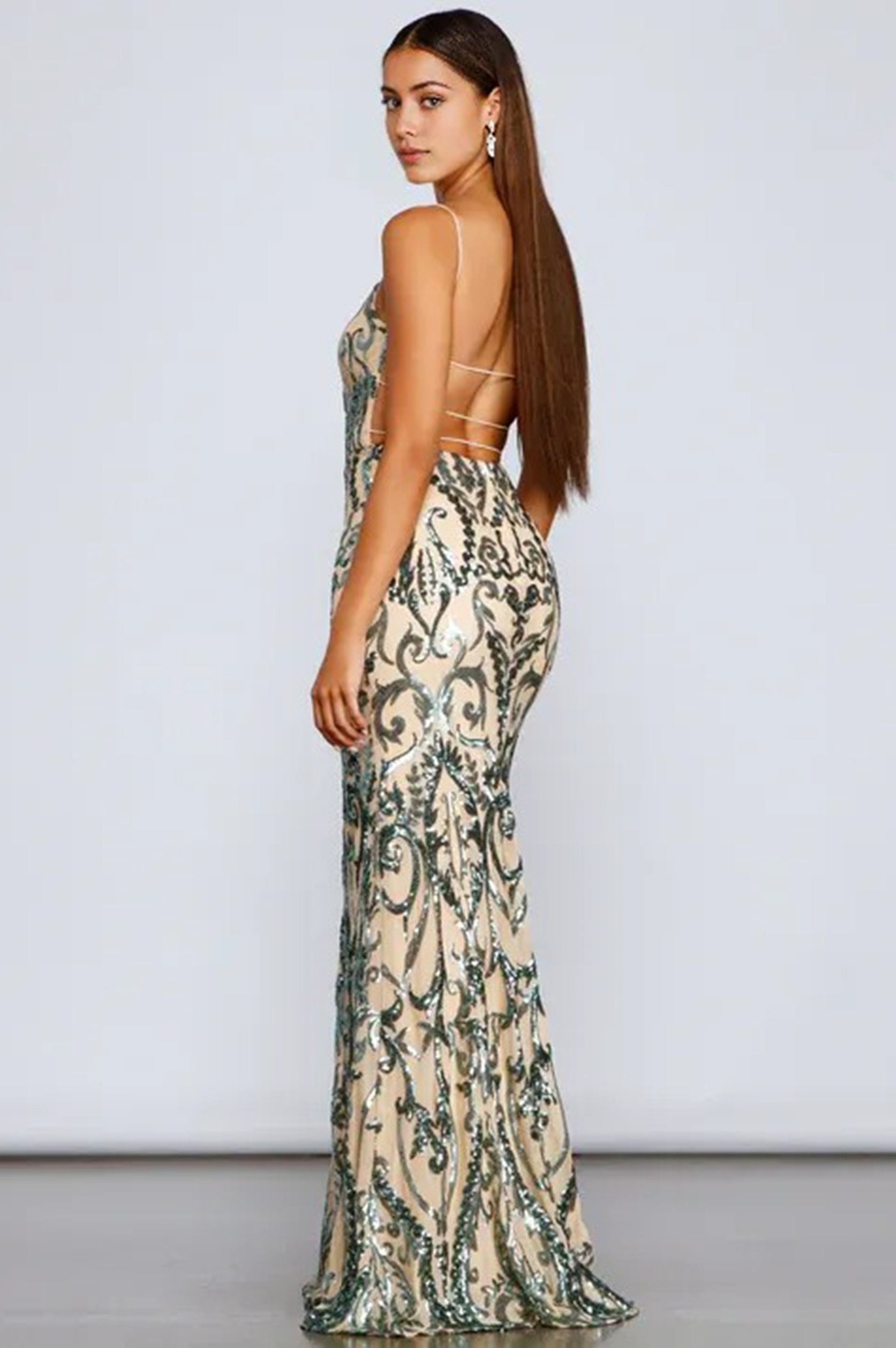 Bring the sparkle with a formal dress that dazzles from all your best angles! features a sleeveless scoop neckline with padded cups, bungee spaghetti straps, a bold backless design accented with bungee bar straps, a sequin scroll print pattern, and a mermaid silhouette. The dress is composed of a lined mesh fabric that offers a form hugging fit with minimal stretch. Complete look with rhinestone heels and a clutch.Â